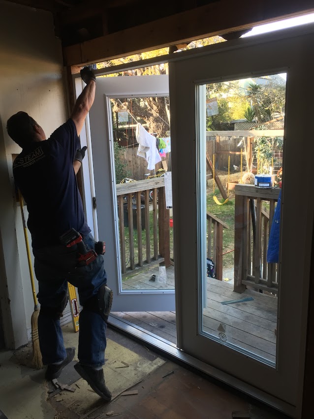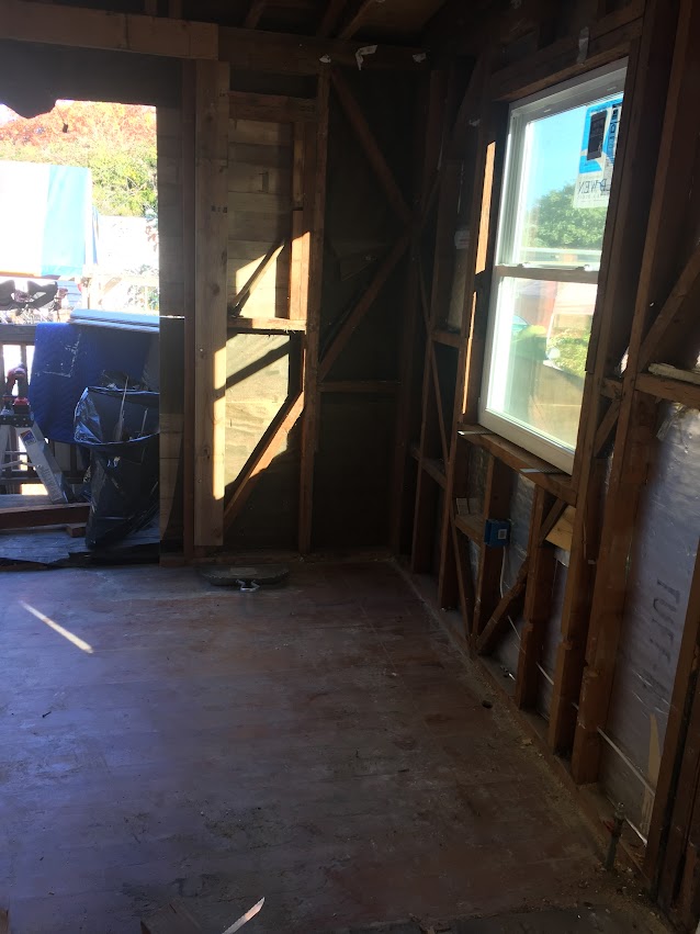 I took out the door and that old window on the right. I installed a temporary header to carry the rafters while I ripped out that door and made the opening large enough for french doors.