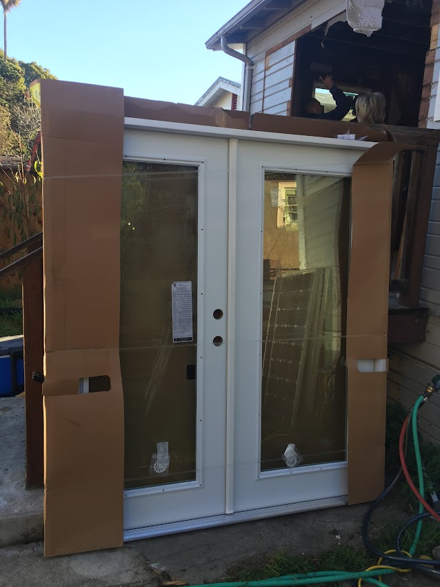 I took out the door and that old window on the right. I installed a temporary header to carry the rafters while I ripped out that door and made the opening large enough for french doors.