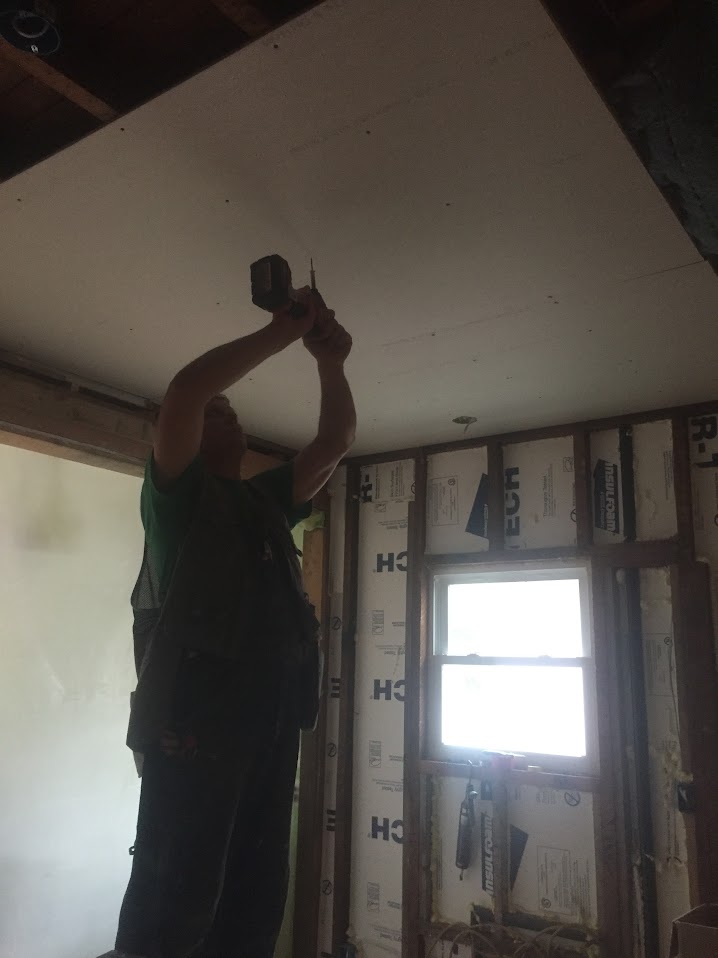 The ceiling was difficult but Tabitha and Tristan were a big help. The ceiling in this half of the kitchen is 9ft tall. I made a small scaffold--of sorts.